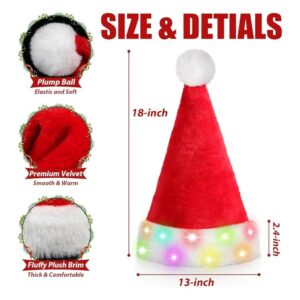 - SAFE AND RELIABLE--LED lights are sewn into the inner lining of the Santa hat; The battery and switch are hidden in the white brim, which can separate the LED lights and the power from your head; Very comfortable and reliable; Celebrate Christmas with a safe light up Santa hat